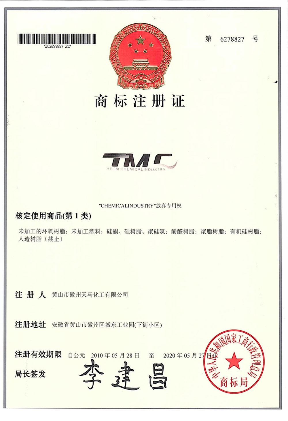 2010年注冊天馬TMC商標